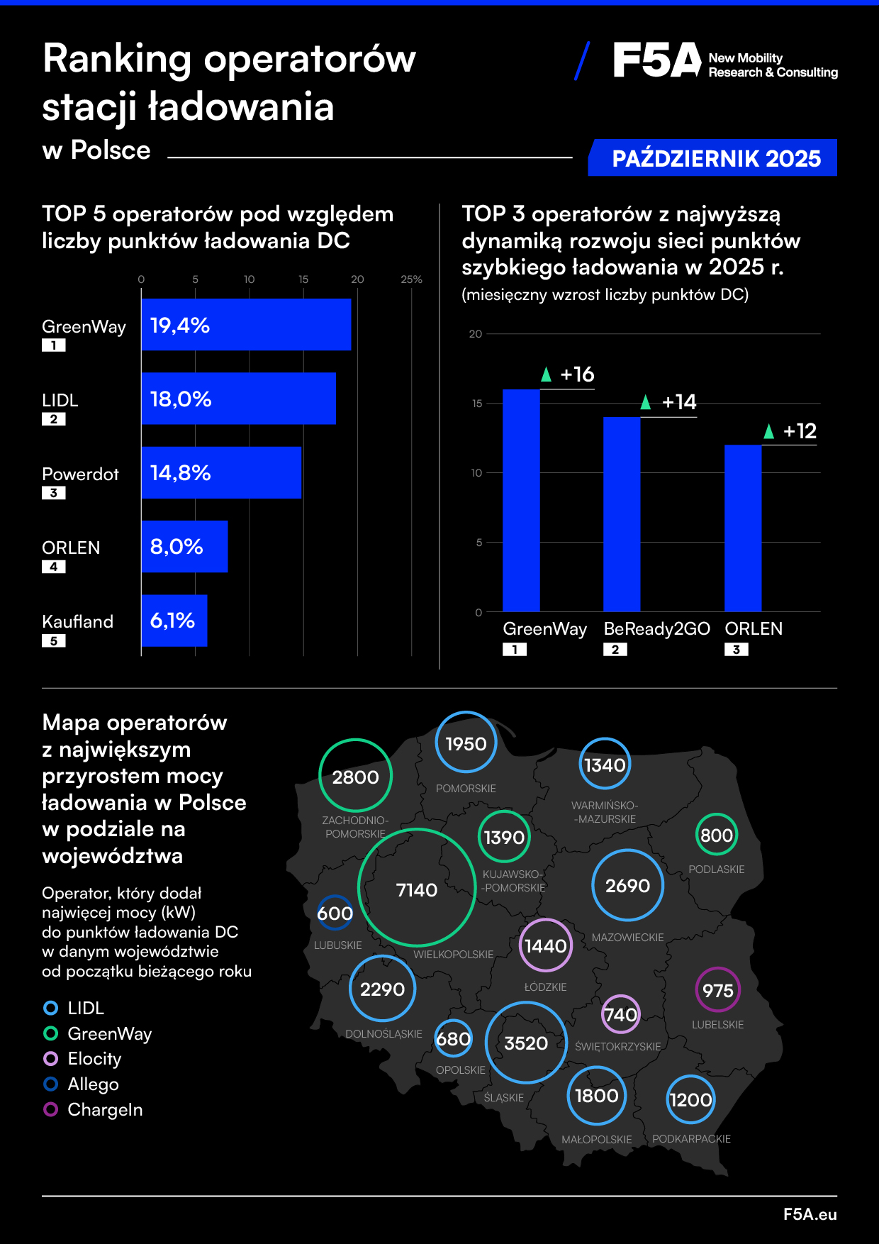 W październiku GreenWay (19,4%) ponownie umocnił pozycję lidera rynku szybkiego ładowania, odnotowując jednocześnie najwyższy miesięczny przyrost: +16 nowych punktów DC. To o tyle istotne, że jeszcze niedawno LIDL był bardzo blisko objęcia pierwszego miejsca, jednak obecnie jego udział ustabilizował się na poziomie 18,0%.