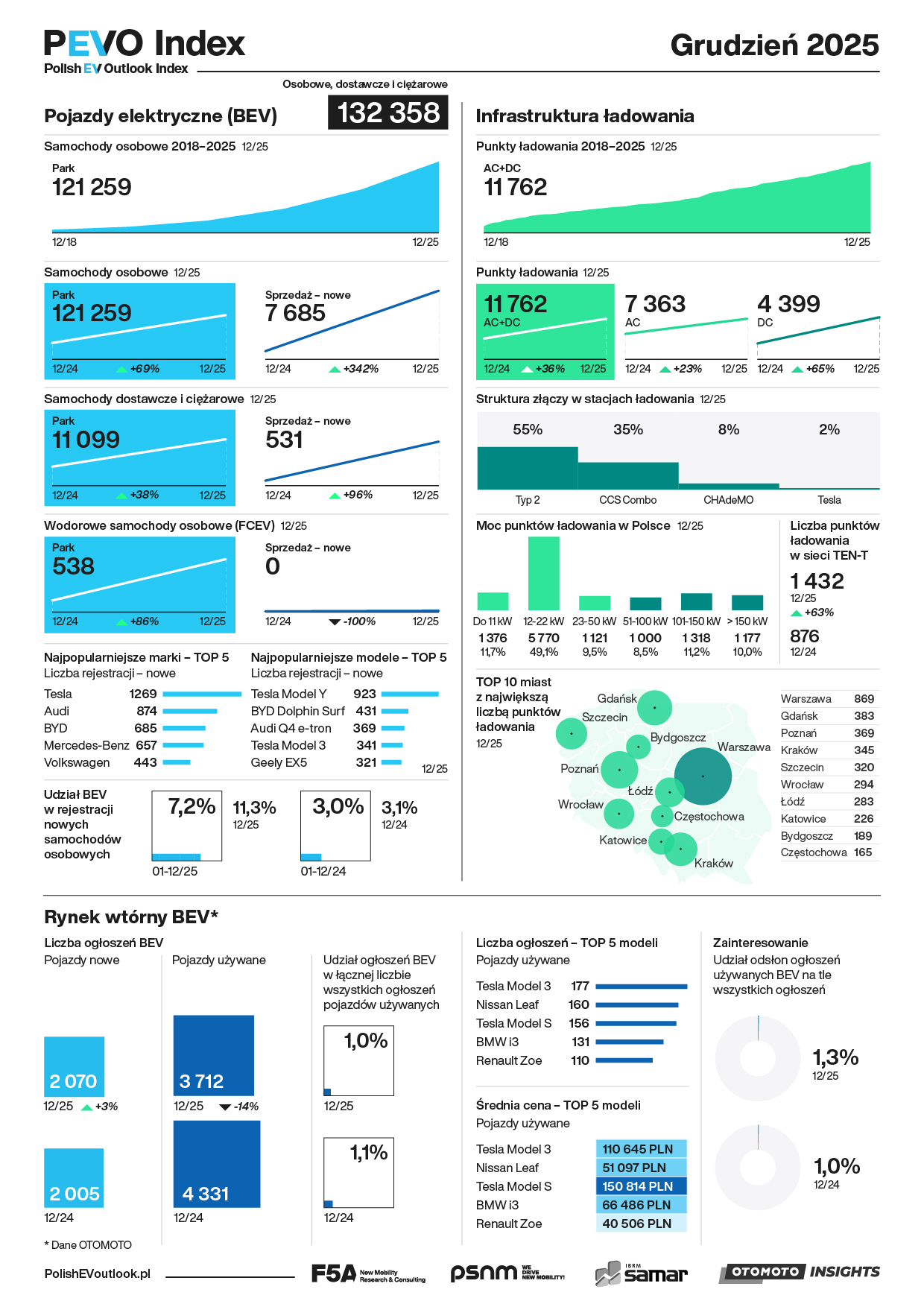 Polish EV Outlook Index (PEVO Index) to comiesięczne zestawienie kluczowych danych i statystyk sektora e-mobility w Polsce. Na koniec grudnia 2025 r. łączna liczba zarejestrowanych w Polsce samochodów całkowicie elektrycznych (BEV) wynosiła 132 358 szt. Udział BEV na rynku nowych samochodów osobowych wyniósł w grudniu 11,3%, a w całym roku – 7,2%.